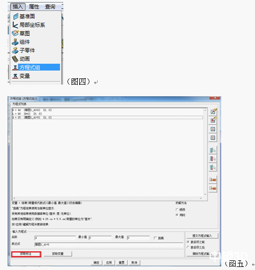 四、点击“插入”菜单中的“方程式组”,在如下对话框中的表达式处点击图中红框所示“获取标注”,选取尺寸为20的标注,即图中表达式中的“草图1_d1”,逐个设置各个变量(图四、五)。