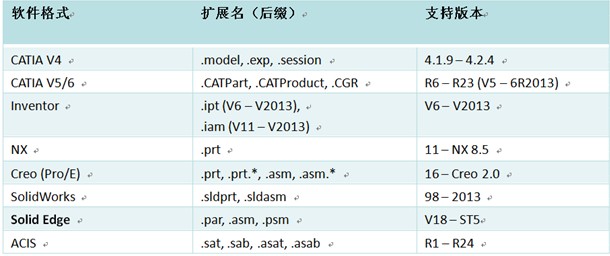 其次,看看数据输入方面,xelega3D 2014在原基础上增加了SolidEdge、ACIS的数据格式,使兼容面进一步得到扩展,几乎含盖了目前国内所有的三维设计软件。以下是xelega3D 2014版兼容情况: