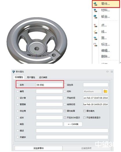 第六步:打开手轮图档,点击属性-零件属性,可以看到,零件名称同步修改,如下图所示
