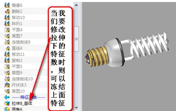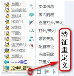 3、当我们变更拉伸参数时,则其他特征参数不受影响。如下图鼠标选中拉伸项,执行鼠标右键,选取下图红圈圈位置,进行特征重定义,如下图: