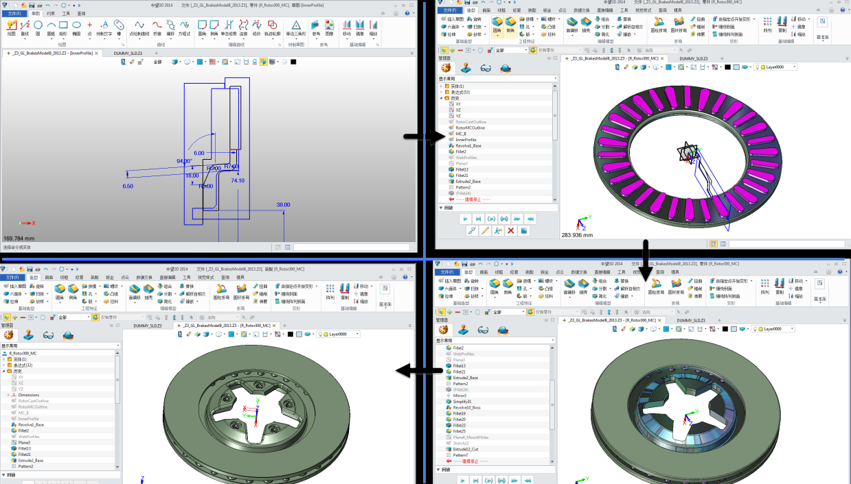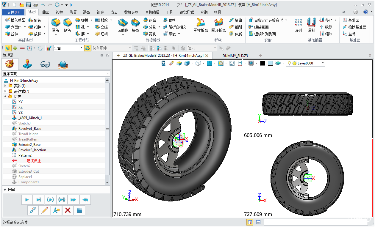 其中在画轮胎花纹的时候,主要使用了xelega3D的阵列和替换面的功能,简单几步就在旋转主体上面做好了复杂的花纹,这是令我觉得很好的地方,整个轮胎的设计在xelega3D特征树不超过15步,让我节省了很多时间,使得后面能重点关注在制动器机构的设计。