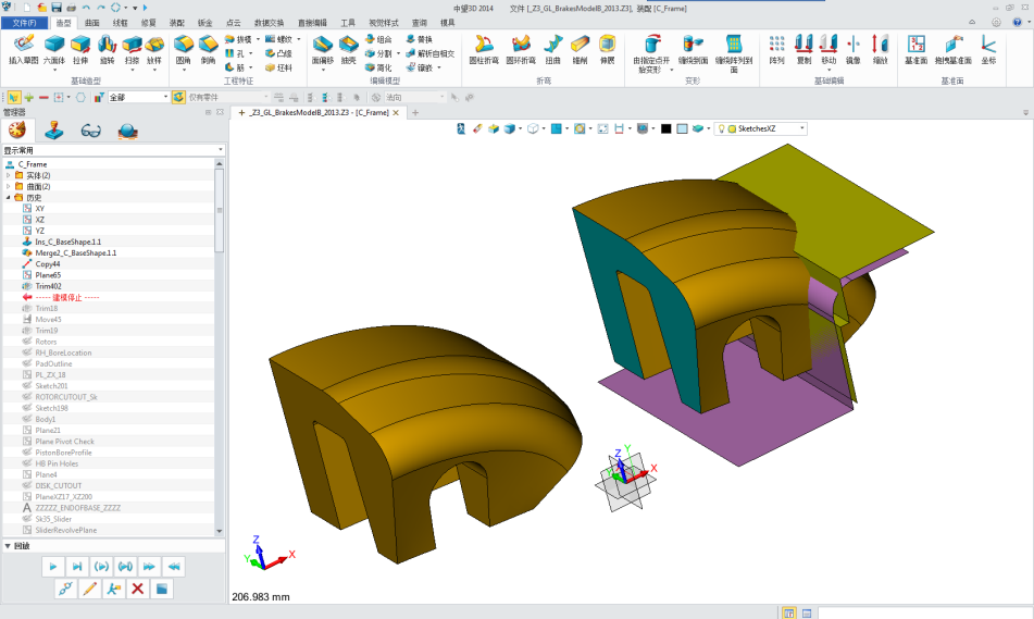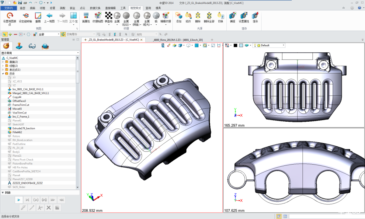 4. 刹车钳的设计花了不少时间,一方面是刹车钳的工程要求较高,对强度刚性有要求;另一方方面自己对曲面建模不是很熟悉。但是设计下来发觉xelega3D的曲面还是相当不错的:首先单个零件支持多实体设计,其次实体和曲面的混合建模,显得更灵活自由,也确保能够获得想要的造型。最后xelega3D在一些细节特征的设计上如倒圆角、孔等也表现出色,很好的在复杂的边缘倒圆角成功并且创建出符合GB的各种螺纹孔。