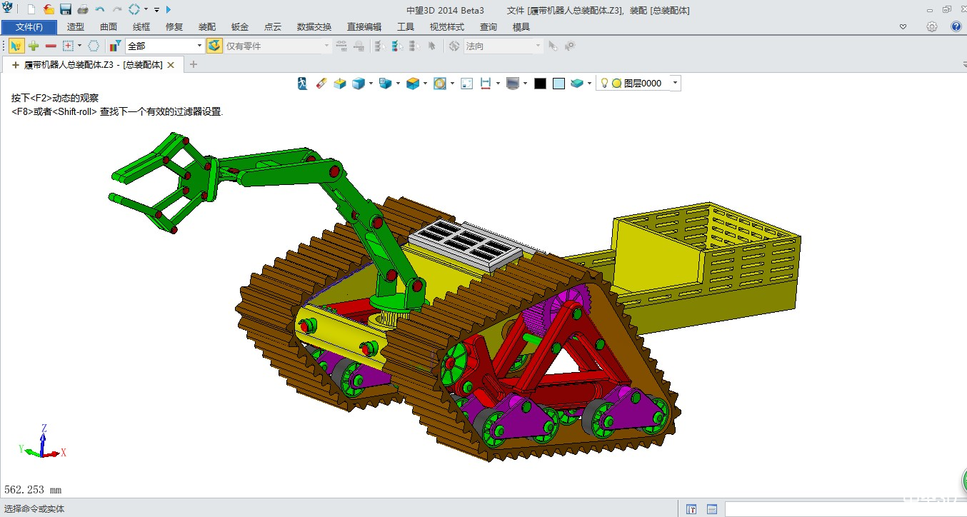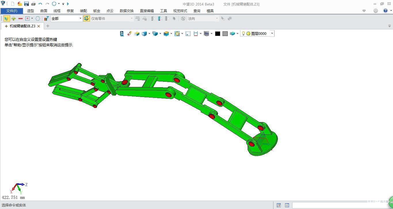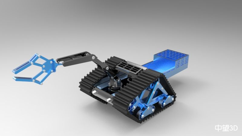 当时在设计机械臂部分时,刚开始不太熟练,以为xelega3D装配体肯定很复杂,结果我发现它并没有类似于catia那样的繁琐,较之solidworks也是非常快捷的,这更加坚定我使用xelega3D设计了,所以我以该履带机器人中机械臂为例大致说一下建模过程,该机械臂如图所示: