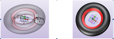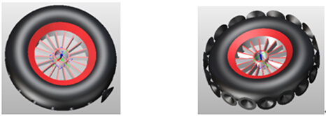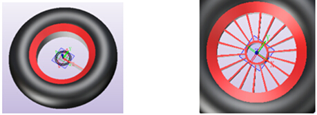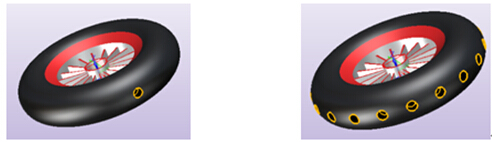 (3)建一个与轮胎相切的面,在新建的面上画出与吸附爪相配合的孔的外形用拉伸画出孔,再环形阵列完成吸附车轮的制作,见以下图3;