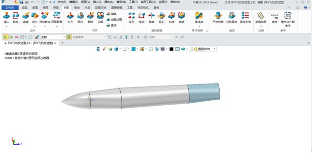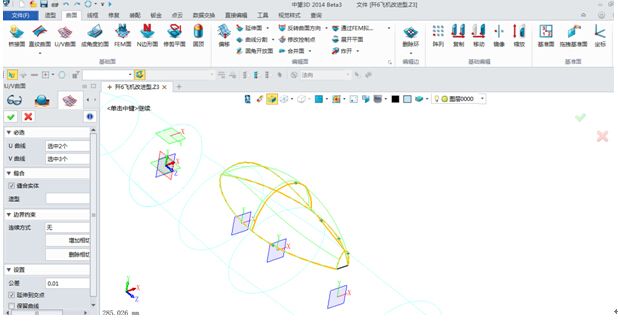 第二步,选择造型中的放样命令,对草图进行放样,注意放样时方向的选择,从而完成机身的建模,如下图所示: