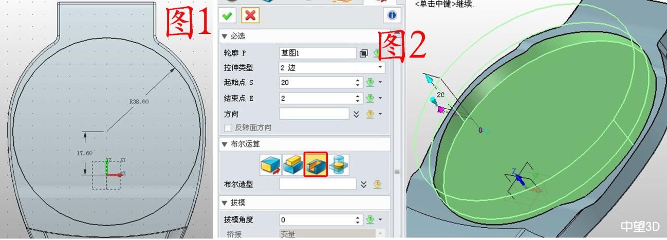 1. 在左侧“底座”组件上右击,点击“编辑”,快速进入编辑状态。在XY面插图草图1,绘制图1所示的圆,参数如图;用拉伸的减运算拉伸草图1,参数如图2。