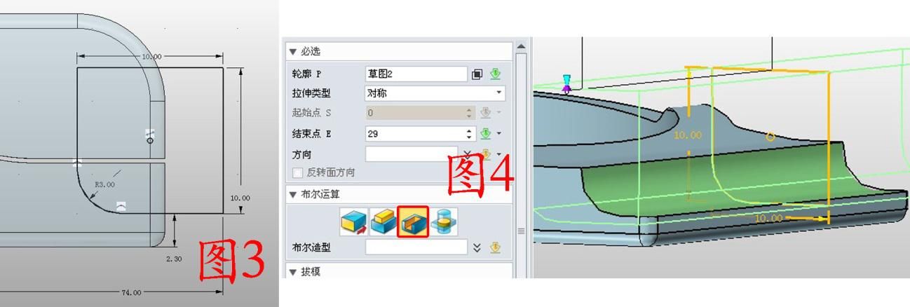 2. 在YZ面插入草图2,绘制图3所示的图形,注意绘制完成后将有圆角部分的线连接成整体,这样拉伸出来比较美观;用拉伸的减运算拉伸草图2,如图4。