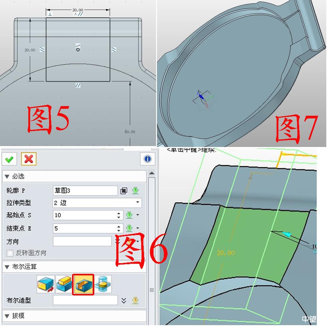 3. 在XY面插入草图3,绘制图5所示的矩形;还是用减运算拉伸草图3,如图6;将边缘部分做圆角,如图7。