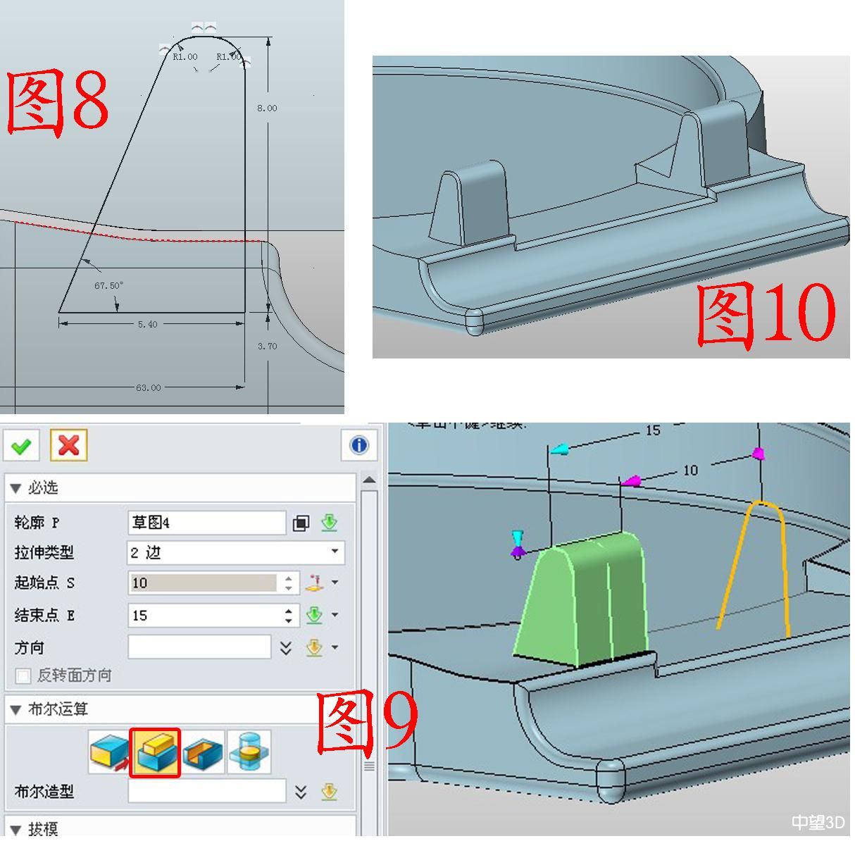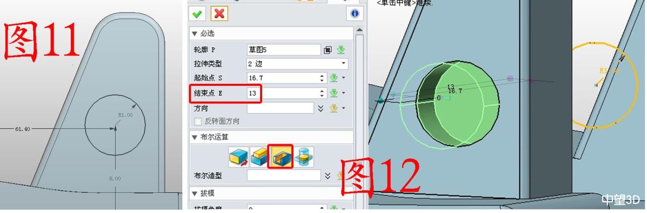 5. 在YZ面插入草图5,绘制图11所示的圆,参数如图;用减运算拉伸草图5,注意,“起始点”可以用捕捉的方式获取(在作图区右击“目标点”,将鼠标放在起始部位点击即可),还是保留轮廓,做另一侧的拉伸,如图12,此时“结束点”是13,要记住13这个数据,因为后面还要用到,当然是其他适当的数字也可以,不过后面要和后面涉及到的一个参数一致。