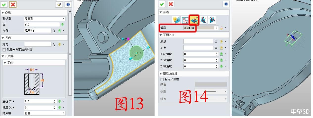 6. 点击造型——孔,在图13所示的位置打孔,参数如图13;插入XY基准面,“偏移”数据用捕捉的方式获取,此时右击作图区,选择“曲率中心”将鼠标放在孔的边缘,点击即可获得参数,如图14。