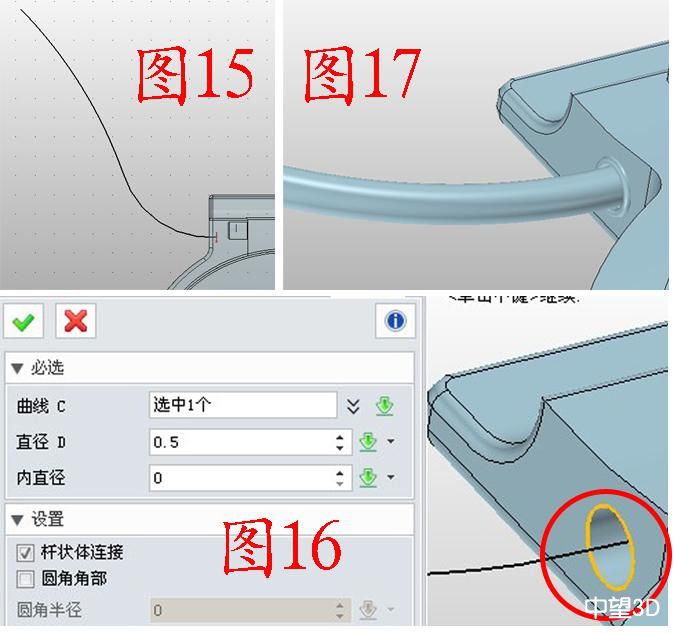 7. 在基准面上插入草图6,绘制图15所示的样条曲线;点击造型——杆状扫掠,曲线选择孔的边缘(图16红圈所示),直径为0.5;同理,将草图6也用杆状扫掠处理,效果如图17。