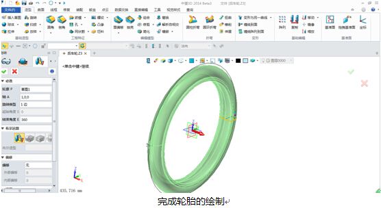在这里要注意圆弧的绘制中位置的确定。完成草图绘制后退出,选择旋转命令,完成轮胎的绘制,如下图所示: