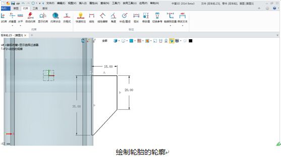 第一步,轮胎的绘制。选择XY平面插入草图,绘制轮胎的截面草图,如下图所示(图中已给出尺寸):