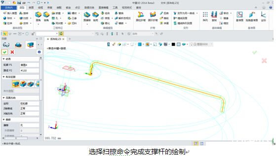 第三步,轮胎支撑杆的绘制。分别绘制支撑杆的轮廓和路径草图,然后选择扫掠命令完成支撑杆的绘制,如下图所示: