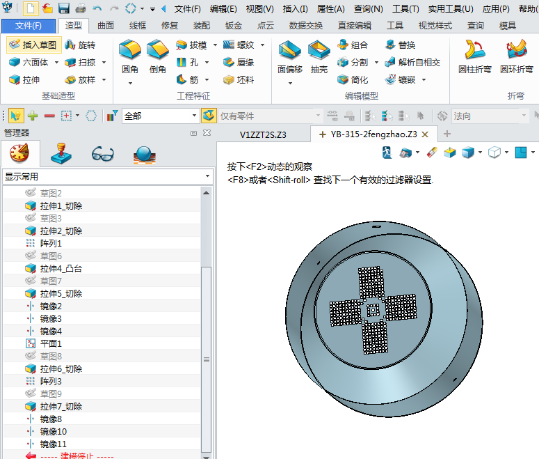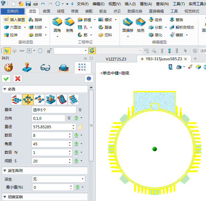 4、绘制凸台,点击草图键,绘制凸台轮廓,拉伸完成1个凸台,再使用xelega3D的阵列命令,选择圆形阵列完成其它凸台的设计,这样就避免了重复设计的麻烦,如图: