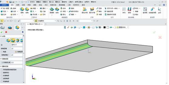 第二步,圆角处理。在造型圆角命令中,选择椭圆圆角,选取基体底部边,倒角距离10mm,倒角距离2为20mm,从而实现一边两个方向的倒圆角处理。如下图所示: