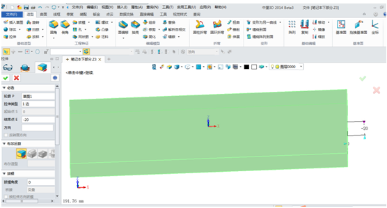 第一步,拉伸基体。这是一个基础的命令。基本上,所有的造型都是从拉伸基体开始的。选择XY平面,插入草图,绘制一个长377mm,宽245mm的矩形。点击退出,选择拉伸命令,结束点选择20(正负号为拉伸方向,根据自己的爱好选择)。点击确定,完成拉伸基体操作。如下图所示: