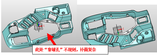 产品分析:1.产品分型面不规则;2.产品“靠破孔”多,且不规则,补面复杂.。