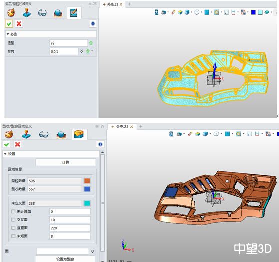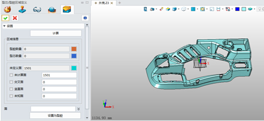 2.选择“计算”,并选择开模方向“Z”轴方向,系统自动计算上下模区域,计算结果如下: