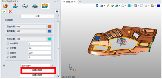 3.根据实际情况定义“竖直面”“交叉面”和“未知面”,这里全部定义为“型腔”区域,如图: