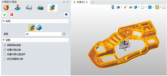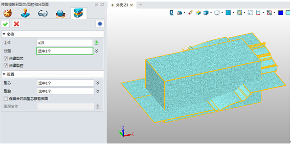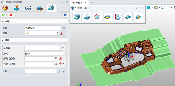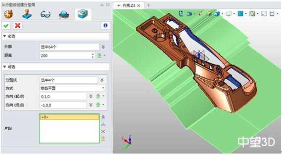 4.对产品进行“分离”,析出上下模型腔面,为模具分型面做准备: