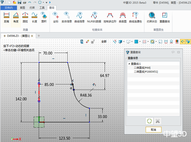 第三步:使用【重叠检查】功能检查线条。点击【重叠检查】,红色显示重叠部分,一般来说重叠对象是很难被发现,但软件增加了清晰的列表及标注后,用户就能灵活地决定是否删除相关重叠部分,如图3所示。